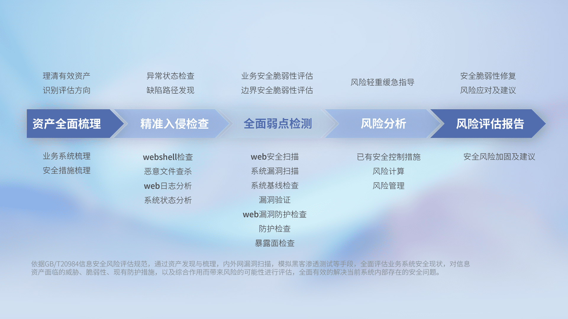 针对客户行业特性,,以专业的安全服务+多厂商联合解决方案提供专属的一站式安全管理服务,,帮助客户全面感知网络空间威胁,,,基于识别、、、、检测、、、分析、、防护、、监测、、、响应的服务理论模型,,从方案咨询、、集成交付、、评估验证、、、、优化加固、、、、运维运营,,,,致力于为客户提供完整的闭环管理式安全服务。。。。以实战经验为客户打造高抵御风险的安全体系,,,帮助客户发现威胁、、、对抗威胁、、、处置威胁,,,,不断积累安全对抗能力,,,持续保障数字化安全。。